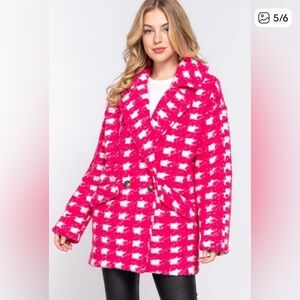 Eye-catching houndstooth pea coat in bright pink and white. Soft plush texture for cozy layering. Double-breasted front with flap pockets. Oversized, fashion-forward silhouette.