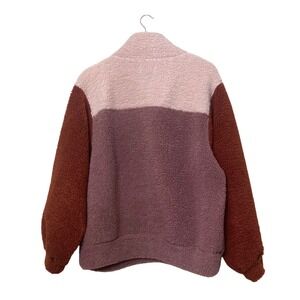 Universal Thread Goods Co. quarter-zip fleece pullover in a cozy colorblock sherpa design. This warm layer features a blend of soft pink, mauve, and rust brown tones, perfect for chilly weather. Constructed with a high collar, elasticated cuffs, and a relaxed fit, it offers both comfort and a modern aesthetic. The plush sherpa texture provides excellent insulation while remaining lightweight.
