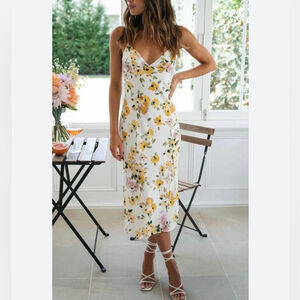 White slip dress with thin straps. All-over yellow and green floral pattern. Soft, lightweight fabric. Feminine and easy to wear.