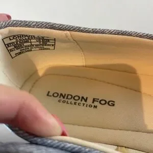 London Fog Bixby ballet flats offer a sophisticated blend of casual denim-style uppers and elegant hardware details. These slip-on shoes feature a classic round toe silhouette adorned with a prominent brown textured buckle accent for a touch of equestrian-inspired flair. Designed for comfort, the interior includes a padded footbed with the London Fog Collection branding, while the durable rubber outsole provides reliable traction for everyday wear.