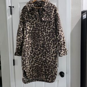 Leopard print trench coat by F&F. Button-front with chest pockets. Soft textured fabric with long sleeves. Classic collar and relaxed silhouette. Easy to style for day or night.