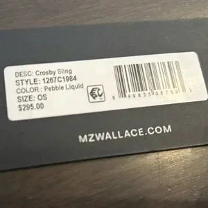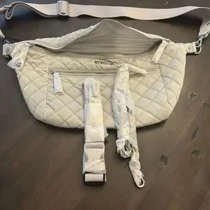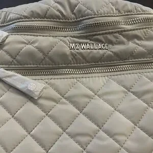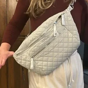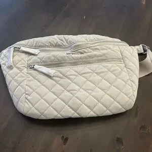 Stylish quilted Mr Wallace crossbody sling bag in pebble liquid color. Features multiple zip pockets for organized storage and an adjustable strap for comfortable wear. Additional strap included. New with tags never used. Lightweight and versatile for everyday use. The light white color pairs easily with any outfit.