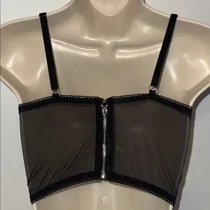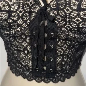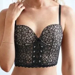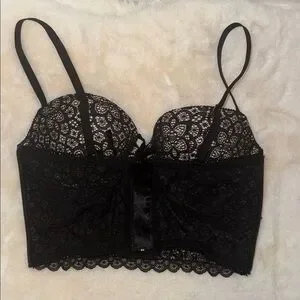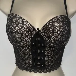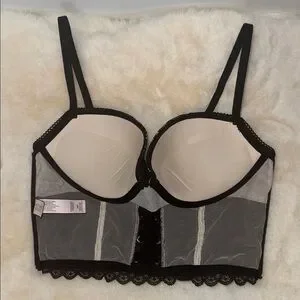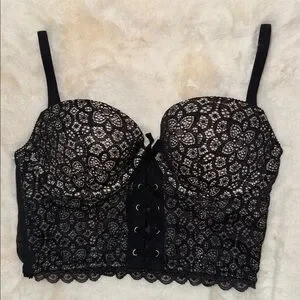 Victoria’s Secret Padded Demi Push-Up Bustier Bra Top Black Lace Women’s 36B. Longline, underwire, graduated padded cups, corset lace up styling in the front, sheer mesh zip back, adjustable straps. Excellent condition.