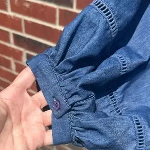 Elegant indigo blouse with button-back design. Features puff sleeves. Ideal for chic casual wear.