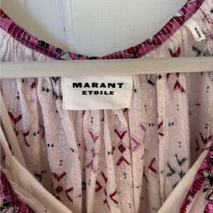 NWOT Chic Marant Etoile dress with intricate red and white patterns. Features a flattering V-neck and ruffled sleeves. Separate cotton lining. Dress is one size, lining up to an 8.