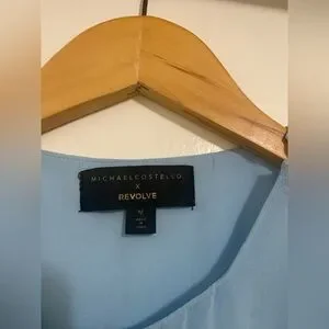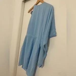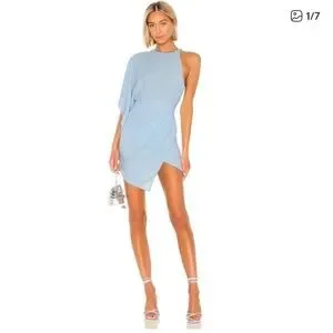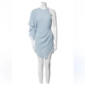 Sophisticated one-shoulder mini dress by Michael Costello. Pale blue hue with elegant draping and asymmetric hem. Slim, flattering silhouette perfect for evening events. Minimal, modern design that pairs well with heels.