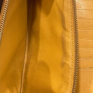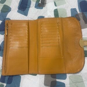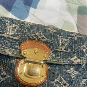 Louis Vuitton denim monogram wallet in blue with signature LV pattern. Features a gold-tone push-lock clasp and leather trim. Stylish compact design for daily use. This is used condition, there is rubbing to hardware, coin pocket has coin residue. The denim has some minor stains that may or may not come out. Leather is in great condition on the inside except one dot that looks like a pen spot.