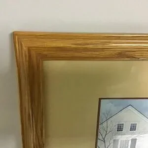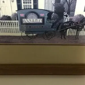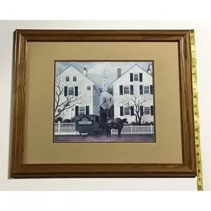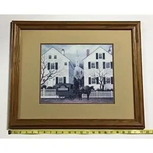 Up for consideration is a preowned Charles Wysocki framed art print called "My Milkman, My Confidant, My Lover, My Husband" that captures a serene Americana old Americana town. The artwork depicts a milkman with parked in front of a row of houses in a small-town setting. This piece is professionally matted in a neutral in a classic oak wood frame, making it a perfect addition to rustic, farmhouse, coastal home, or traditional home decor. The oak frame does have some minor chips. Please review the pictures. They are not very noticeable, but this is a preowned piece.