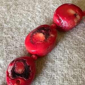 Handmade red beaded necklace that adds vibrant color to any outfit. Lightweight and comfortable for everyday wear. Features glossy red beads for a standout, modern look. Easy to style for casual or dressy occasions.