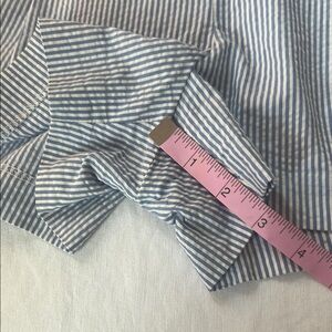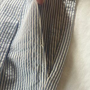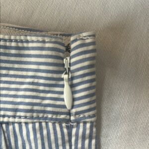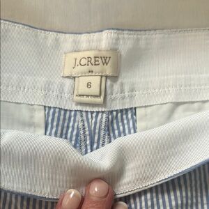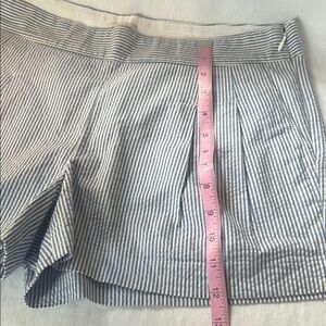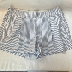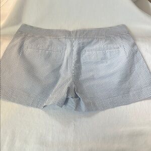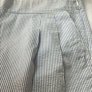 These J. Crew Shorts showcase a light blue and white pinstripe pattern, crafted from lightweight cotton fabric for a crisp, polished appearance. The tailored fit and structured waistband offer a refined look, perfect for summer outings. Pleats in front. Pockets and a side zipper. Size 6. Like new condition.