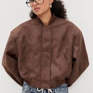 Stylish bomber jacket in rich chocolate brown. Features a sleek design with a comfortable fit. Ideal for versatile wear.