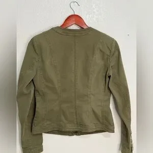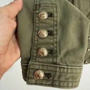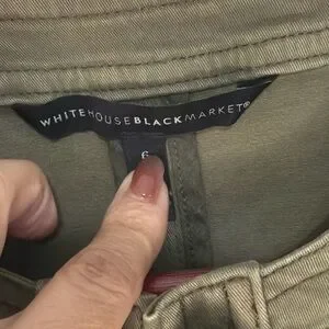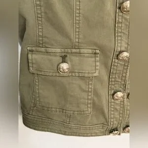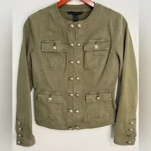White House Black Market olive green military style jacket with gold embossed buttons and structured tailoring. Classic utility design with four flap pockets and decorative button details on sleeves. Slight stretch cotton blend for comfortable fit.
