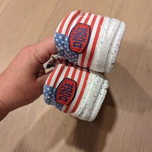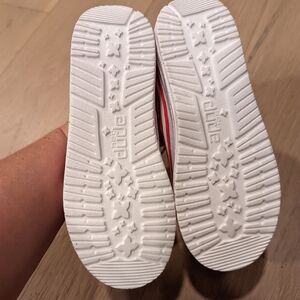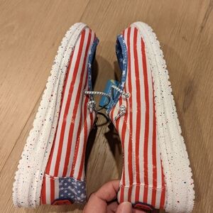 These stylish kids shoes feature a vibrant red, white, and blue design with stars and stripes. Perfect for adding a patriotic touch to any outfit.