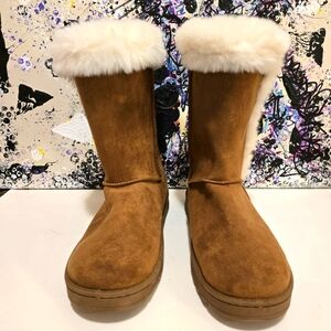 SO Chestnut Abigail Tan Brown Faux Suede Fur Trim Boots Calf Length Size 8.5