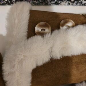 Step into style with these chic faux tan suede boots featuring a cozy faux fur trim. Perfect for keeping warm and fashionable.