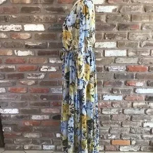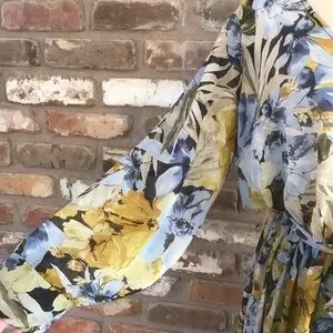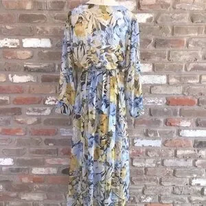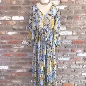 ENFOCUS Women’s Navy Yellow Floral Long Sleeve Chiffon V-neck Maxi Dress 14W