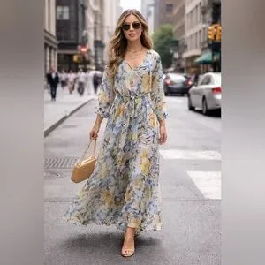 ENFOCUS Women’s Navy Yellow Floral Long Sleeve Chiffon V-neck Flowy Maxi Dress