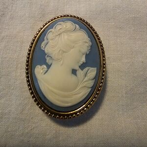 Design: Features a blue and white molded cameo portrait set in a gold-tone frame.