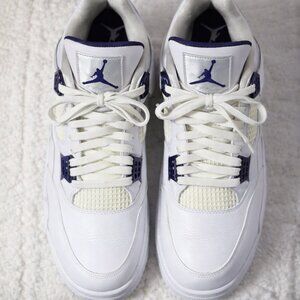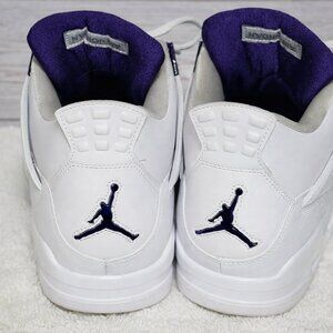 Clean pair of Air Jordan 4 Retro sneakers in a classic white and purple colorway. These shoes have a sleek look that pairs well with casual or athletic outfits.