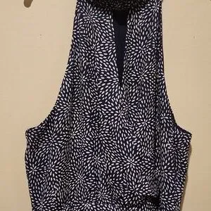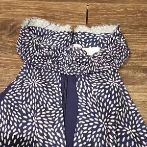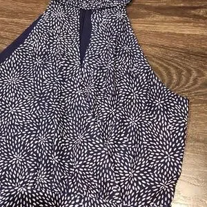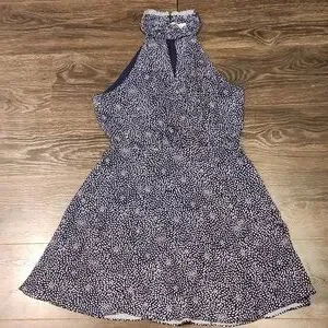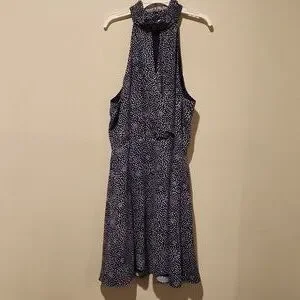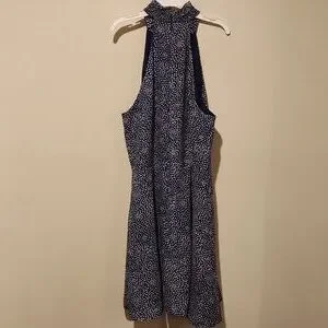 ❤️ PARKER HALTER FIT & FLARE DRESS IN NAVY WHITE PEBBLE DOT, MEDIUM zipper in back. smocked stretchy neck. snap at neckline. fully lined. Measurements are approximate and taken laying flat: 18" pit to pit and 35" long (from height of top of shoulder to hem). 14.5 Excellent condition!