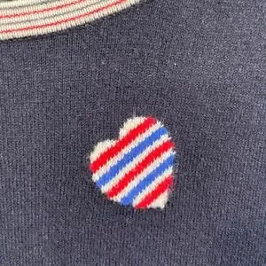 A charming addition to your wardrobe: a navy knit sweater adorned with red, white, and blue striped hearts. This long-sleeved top features a classic crew neckline with a unique tie-back detail, adding a touch of whimsy and sophistication. The soft knit fabric ensures comfort and warmth, making it perfect for layering or wearing on its own. Ideal for casual outings, patriotic holidays, or adding a playful touch to your everyday style.
