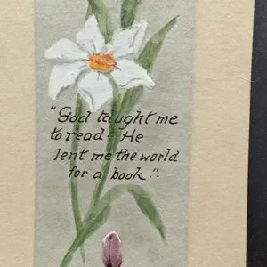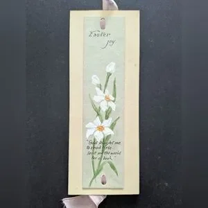 Celebrate the season with this rare and charming antique hand-painted Easter bookmark. Featuring a serene sage green panel mounted on a cream cardstock base, this piece showcases hand-painted white narcissus (daffodils) and a meaningful literary/religious quote.