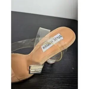 Steve Madden clear strap sandals feature a minimalist design with transparent PVC straps and a striking clear cylindrical block heel. The tan suede-like footbed provides a soft contrast to the modern, see-through elements. These versatile heels include an adjustable ankle strap with a silver-tone buckle, making them a perfect choice for evening wear or special occasions where a leg-lengthening effect is desired.