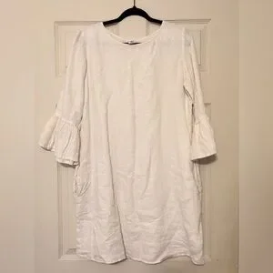 Classic white linen shift dress by Crown Linen Designs. Simple round neckline. Soft three-quarter bell sleeves with subtle ruffle detail. Breezy, versatile silhouette for warm weather.