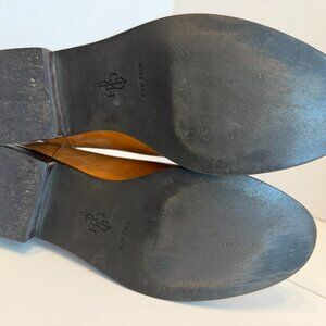 ITEM DETAILS: Beautiful tan and brown pull-on leather ankle boots by Cole Haan in women’s size 8½ B. They feature brown stretch fabric at outer ankle for ease in pulling on/off, brass hooks at back of ankle with pull-on ankle strap and Nike Air soles for maximum comfort. Visible scuffs and wear (see photos for exact condition), but they are beautiful boots.