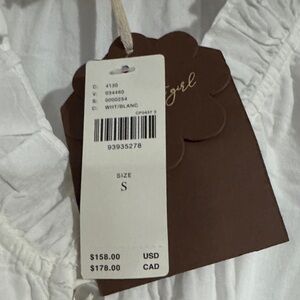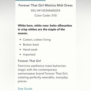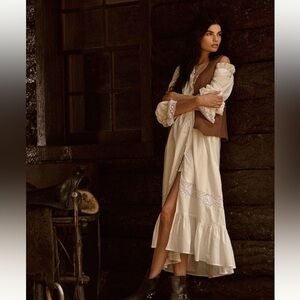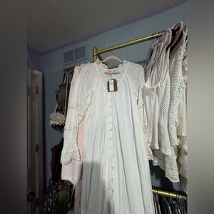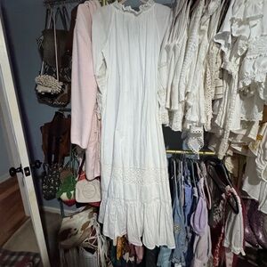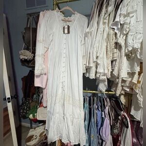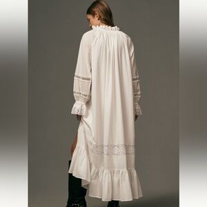 Elegant white maxi dress with lace trim and ruffled cuffs. Button-front detail and a flowing skirt. Feminine and versatile for day or night. From Anthropologie. The dress is very freeform. There is no waste definition. The photo might make it appear like there’s more definition than there actually is. It also runs large. This is definitely not a small. I’m an eight and it fits me the way it’s supposed to fit. Generous and loose.