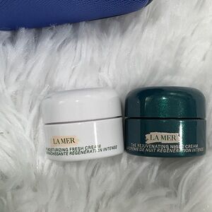 Saffiano-style pouch in vibrant blue. Small La Mer logo on front. Paired with green La Mer sample boxes and white jar lid. Sleek, travel-ready cosmetic organizer.