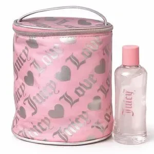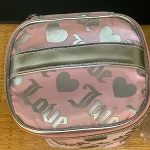Stylish pink cosmetic bag with silver accents. Features Juicy Couture branding. Perfect for travel or daily use.