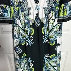 Elegant fabric with black patterns on a gray background. Soft and stretchy material. Black, White, Blue & Lime Paisley Dress