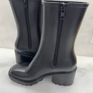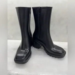 Smooth black mid-calf rain boots with side zipper. Waterproof material protects from wet weather. Chunky lug sole offers grip and style. Sleek silhouette for everyday wear.