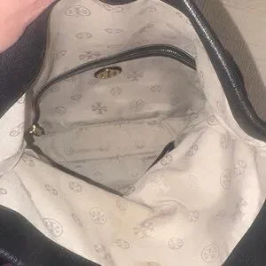 Tory Burch foldover messenger crossbody Bag, black thick and buttery leather, gold tone hardware. Magnetic snap flap closure. Exterior back slip pocket, interior zip pockets& leather-trimmers. ip pockets. Agjuctable strap drop-
