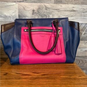 Coach Colorblock Leather Tote in Navy Blue and Hot Pink with Dark Brown Handles