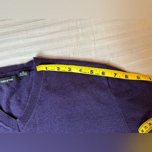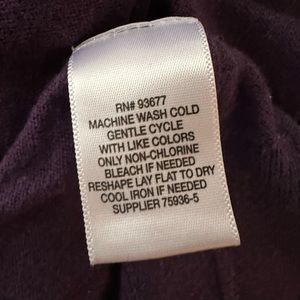 This Claiborne men’s long sleeve, v-neck pullover sweater is in excellent pre-owned condition. Size medium. Color is a dusty plum/purple. Cotton/cashmere blend.