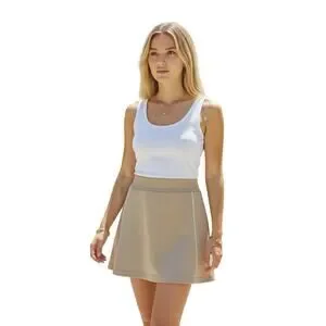 SPANX AirPique Skort — Sporty, sleek, and endlessly wearable. This premium skort in the shade Ashwood (a soft, neutral beige) features crisp white piping for an elevated, athletic look. Crafted from breathable AirPique fabric, it offers a lightweight structure and easy movement with the security of built-in shorts.