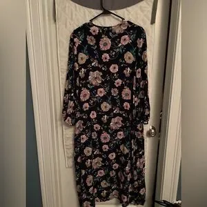 Long with slit sides, bell sleeve. Navy with pink flowers. Worn once and dry cleaned, perfect condition. 100% rayon. (BIN7)