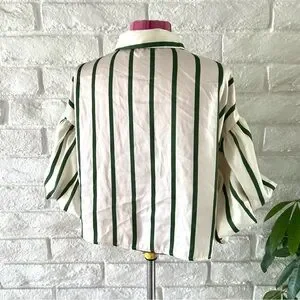 Discover elegance with this stylish button down blouse, featuring striking green and cream stripes. Perfect for both casual and formal occasions.