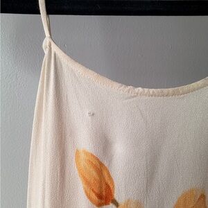 Sleeveless maxi with thin spaghetti straps. Soft cream base with bold yellow floral clusters. Flowing, relaxed silhouette. Simple and easy-to-wear summer style.