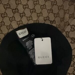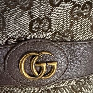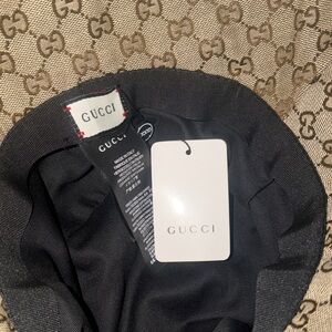 Elegant Gucci bucket hat with signature monogram design. Features tan and brown tones.