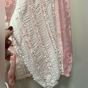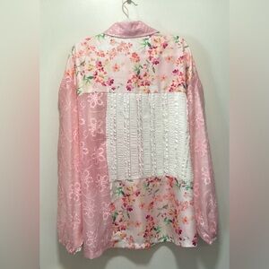 Lightweight elegant button-up shirt with mixed patchwork textures. Pink floral prints and lace panels. White textured stripes add contrast. Feminine and airy style. Great layered look.
