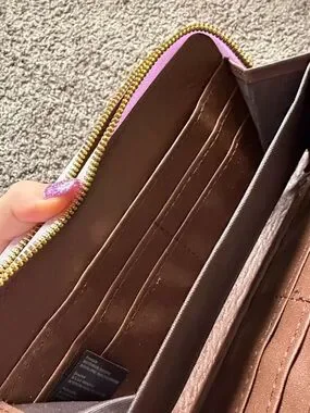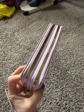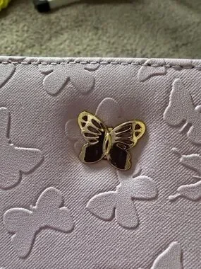 Stylish lavender wallet with an embossed butterfly pattern and a decorative butterfly accent. Smooth faux-leather exterior with secure zip closure. Compact and practical for everyday use. Lavender color adds a soft, feminine touch.