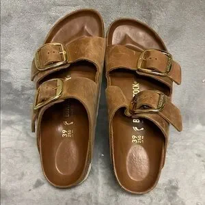 Birkenstock Arizona Big Buckle Slide Sandals Size 39/8 in cognac oiled leather
