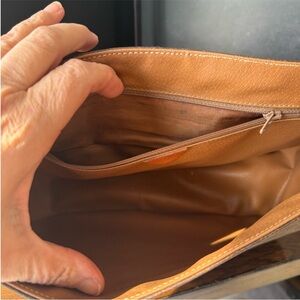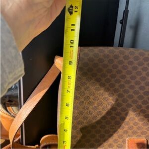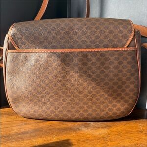 Classic Celine crossbody with signature macadam pattern. Brown leather trim and strap. Flap closure with leather logo patch. Clean, structured silhouette for everyday use.