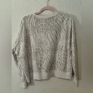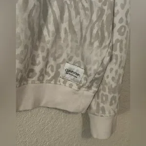 Brand/Style: Calvin Klein Performance women's tie-dyed French terry sweatshirt in a grey/white leopard or animal print with a metallic silver logo.
