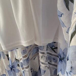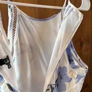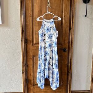 This women’s summer dress features a delightful floral pattern in shades of blue. Perfect for any occasion, it offers both style and comfort. Completely lined to mid thigh. Zipper back closure. Handkerchief style bottom hem. Lulus dress size small. Never worn.
