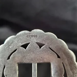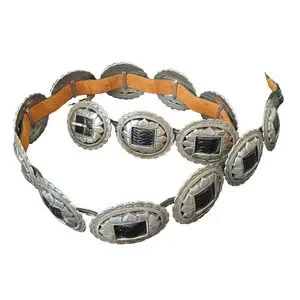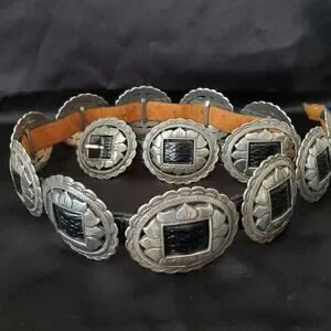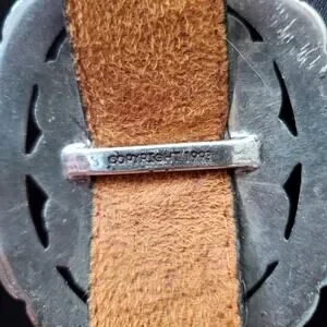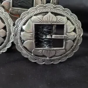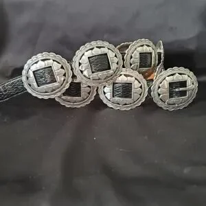 This vintage Brighton 1993 women's black leather belt features a silver concho sunflower design, adding a unique and stylish touch to your outfit. The belt is made of high-quality leather, with a solid pattern and a western, Mexican, or Southwestern theme, perfect for adding a touch of flair to your wardrobe. With a normal belt width and a size L, it is designed for regular size women and comes with a silver hardware buckle for a classic look. Perfect for adding a touch of vintage charm to any outfit.