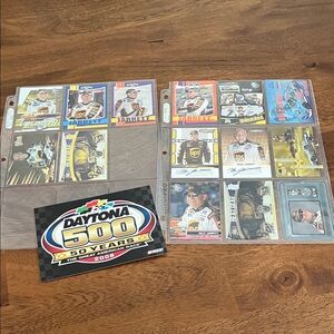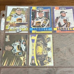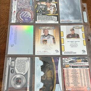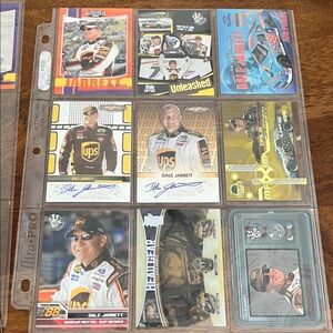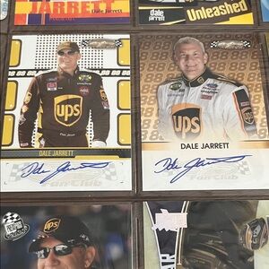 Set of Dale Jarrett NASCAR collectible cards qty 14 plus collectible postcard featuring vibrant designs and iconic racing moments.